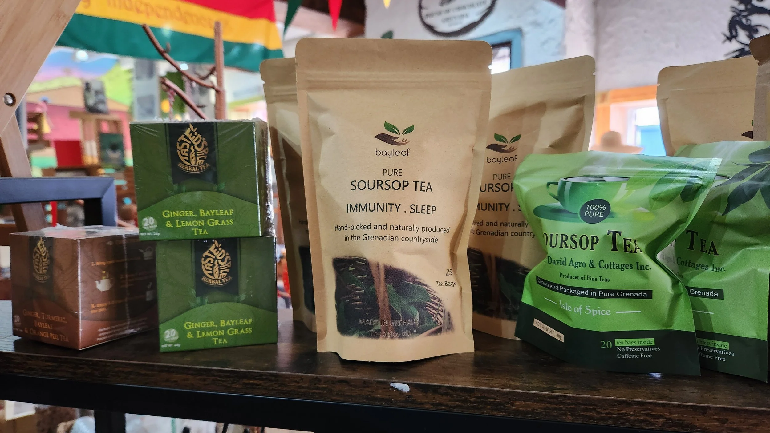 A shop in Grenada with a display of herbal teas. Soursop, bay leaf, ginger, and lemongrass are traditionally used to regulate the nervous system and reduce the impacts of colds and fevers. July 2024.